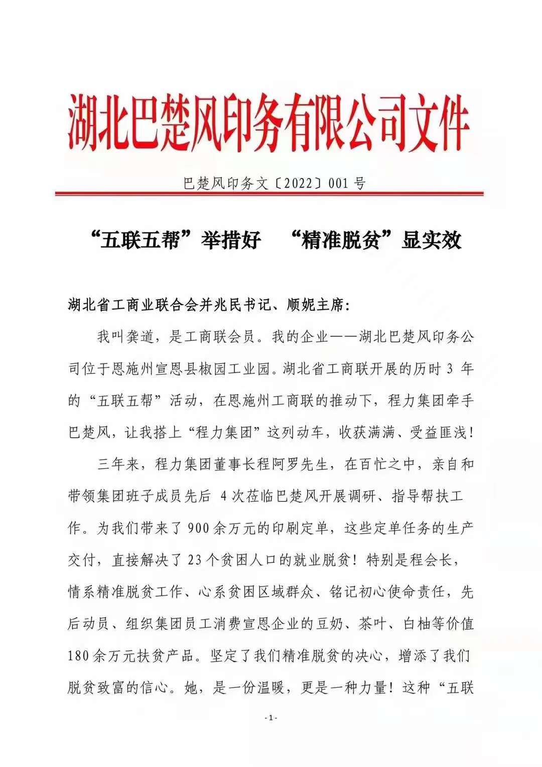 2022年元旦,程力集團(tuán)收到第一份珍貴禮物:“五聯(lián)五幫精準(zhǔn)扶貧”感謝信和錦旗,我們倍感欣慰與珍惜!近三年來(lái),程力對(duì)省工商聯(lián)指定幫扶單位:恩施宣恩巴楚風(fēng)印刷公司,不遺余力給與訂單和消費(fèi)扶貧一千多萬(wàn)元,還從對(duì)其公司管理、黨建、企業(yè)規(guī)范化運(yùn)行等方面指導(dǎo),幫助其企業(yè)走出困境,圓滿(mǎn)完成了脫貧攻堅(jiān)任務(wù)。