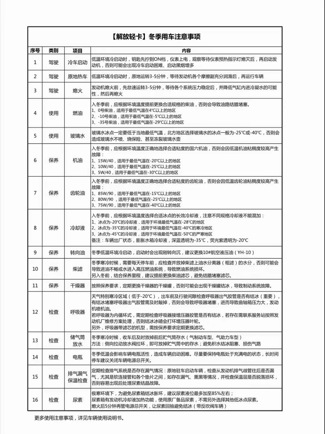 程力解放環(huán)衛(wèi)車溫馨提示:明天開始降溫,請及時更換-10號柴油,并檢查防凍液,玻璃水,機油,尿素是否需要添加和更換。