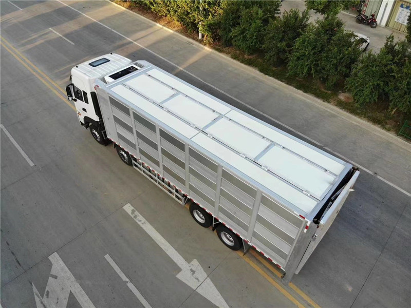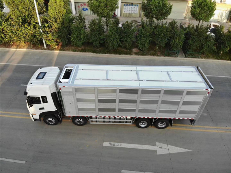 上裝為鋁合金廂式結(jié)構(gòu),廂長(zhǎng)6.8米,寬2.5米,高2.6米,開模型材插接式焊接,車身質(zhì)量輕強(qiáng)度高防 腐蝕性強(qiáng)可耐80度高溫消毒,廂體有效避免高溫傳導(dǎo),內(nèi)部通道和頂板可翻轉(zhuǎn),便于裝卸清洗,車廂恒溫、燃油加熱、監(jiān)控,標(biāo)配三層混合隔倉共18個(gè)降溫噴霧和18個(gè)喂食飲水咀,可開合側(cè)窗、每層4個(gè)高轉(zhuǎn)速防水通風(fēng)排氣扇、每層備用電瓶2個(gè)可供排氣扇使用7小時(shí),風(fēng)扇排風(fēng)量 m3/h 500、1200、1400、2200,后部液壓圍板裝卸1.5噸承載力、同步穩(wěn)定上升速度快、圍板面積5平方,三層每層高850mm四層每層高620mm,裝運(yùn)面積每層14.25平方,三層可拉80頭125公斤豬,4層可拉850頭8公斤小豬苗。