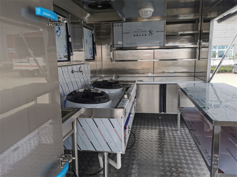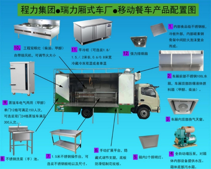 餐車(chē)箱體外冷板,內(nèi)不銹鋼板,5cm復(fù)合保溫板,底板防滑花紋鋁板,廂體帶不銹鋼凈水箱、洗手池、污水箱、燃料箱、不銹鋼爬梯護(hù)欄,加裝雙眼灶、平冷柜、蒸飯車(chē)、不銹鋼菜架等。